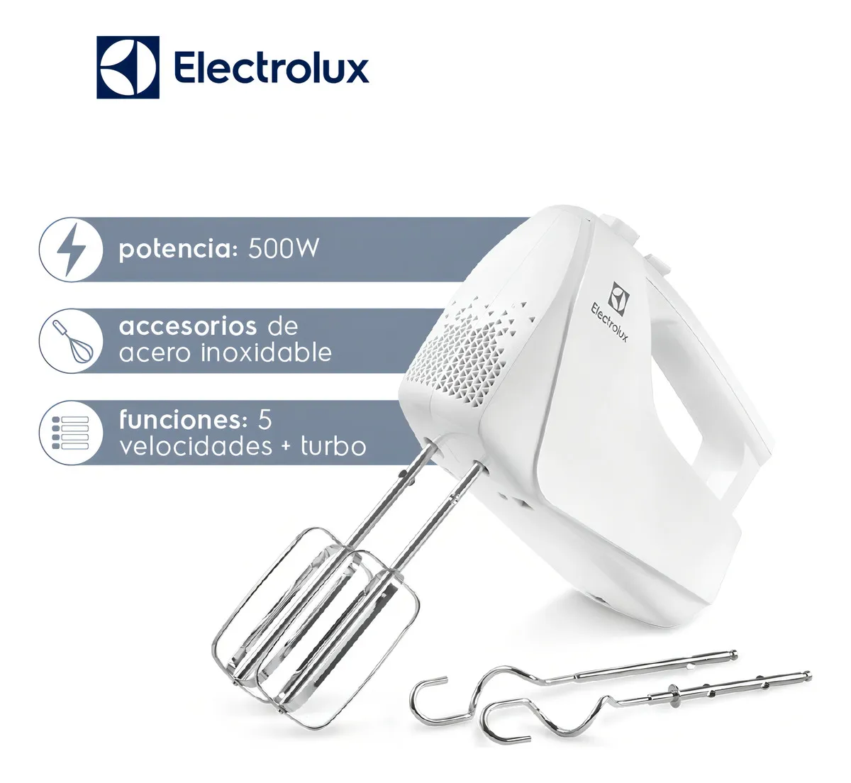 Frecuencia: 50/60Hertz. Voltaje: 220V. Cuenta con 5 velocidades. Los batidores están fabricados en metal. Incluye función turbo. Su potencia es de 500 W. Incluye accesorios