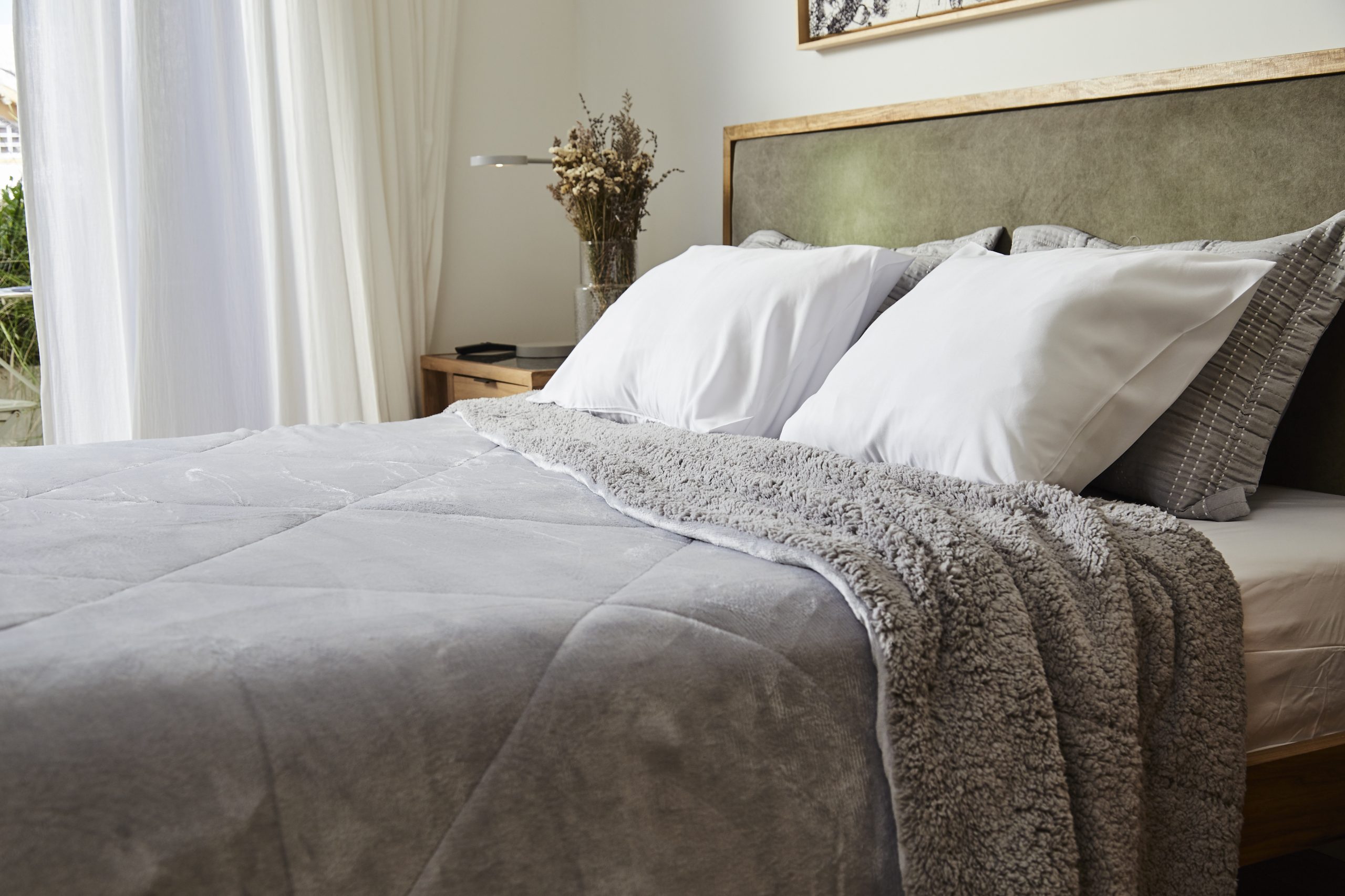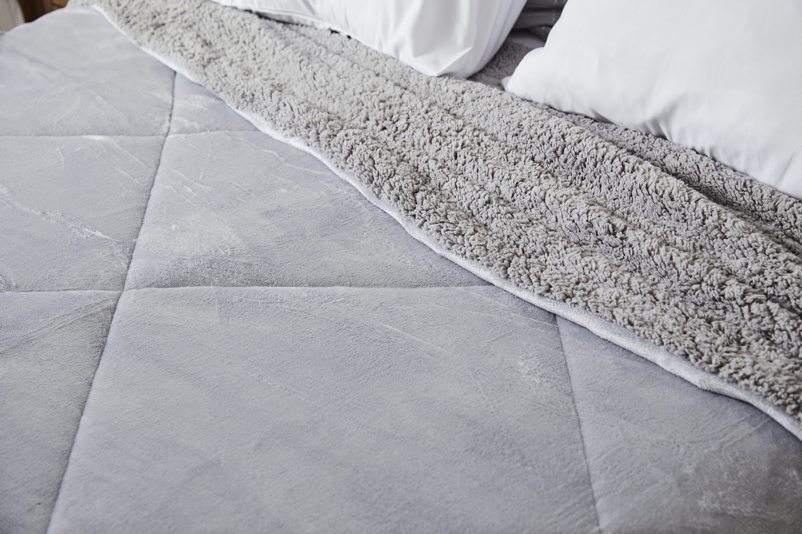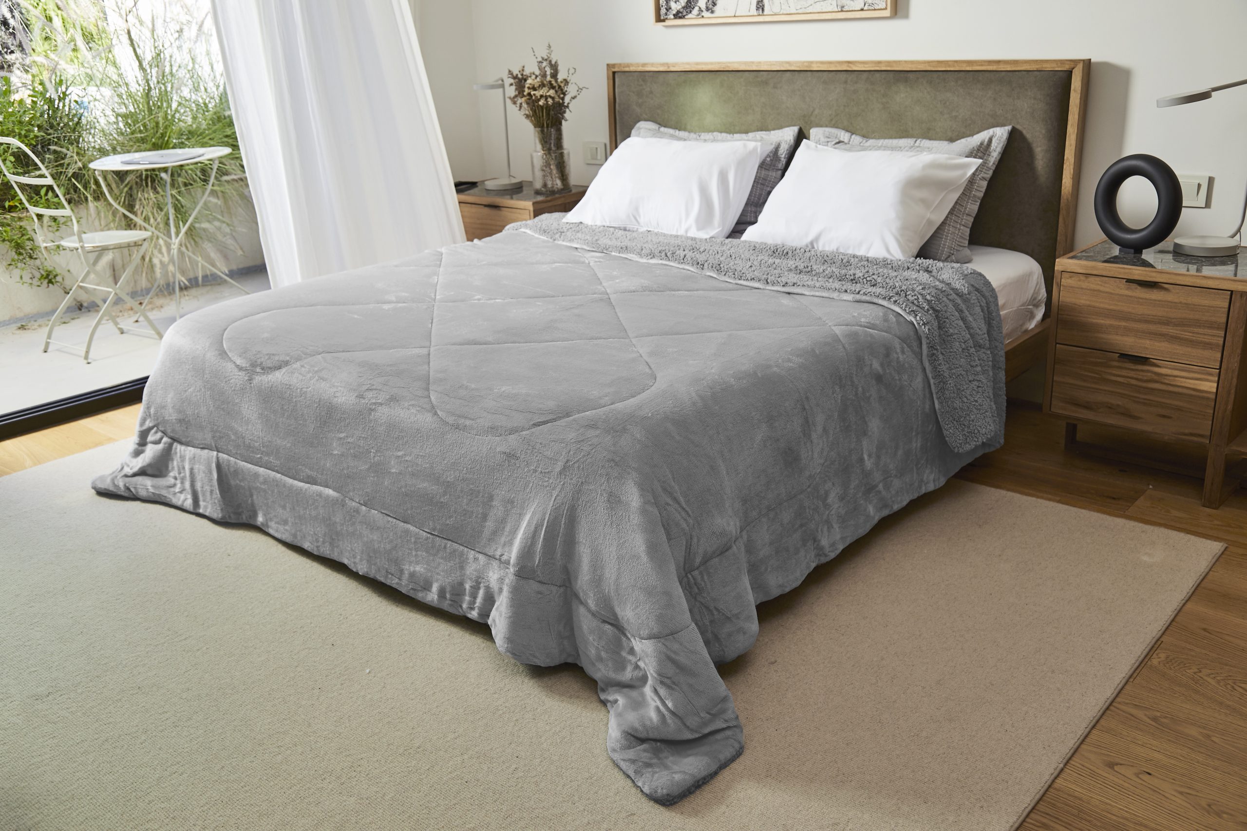 Edredón triple de flannel con reverso de corderito. Composicion: 100% poliester. Tamaño: 2 1/2 Plazas Medida: 220 x 240 Cms. (Para camas de hasta 140 x 190 Cms.) Colores: natural, beige, old rose, marino, gris perla, gris topo.