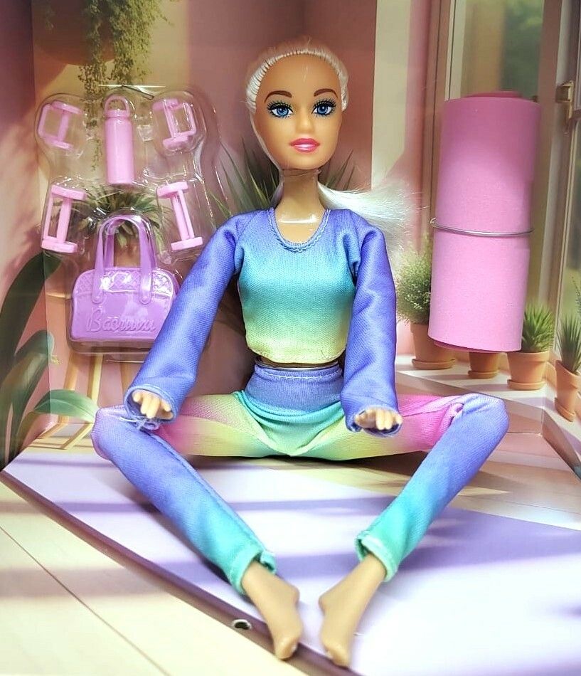Esta simpática muñeca viene vestida con ropa deportiva y trae accesorios temáticos como mat de yoga y cartilla de posturas.