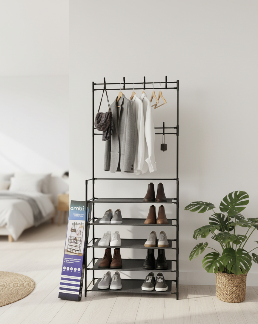 Este perchero con zapatera integrada es la solución perfecta for mantener tu entrada o dormitorio en orden. Gracias a su diseño 2 en 1, puedes colgar ropa y almacenar zapatos en un solo lugar.