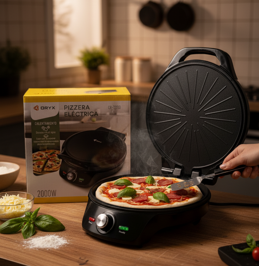 Disfrutá de comidas caseras rápidas y sabrosas con esta pizzera eléctrica de alta potencia. Su diseño compacto y portátil con asa integrada te permite usarla cómodamente en la cocina, en el balcón o donde vos quieras.