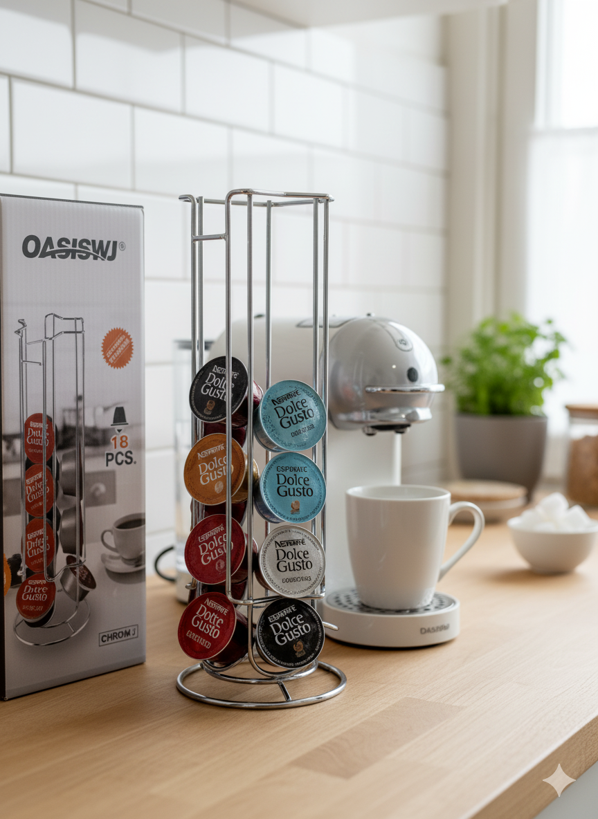 Diseñado pensando en la comodidad y el acceso fácil, este portacápsulas permite mantener tus cápsulas siempre a la mano. Su estructura vertical garantiza un uso eficiente, manteniendo cada cápsula en su lugar sin enredos ni desorden. Cada vez que desees disfrutar de una bebida, tendrás a tu disposición la selección de sabores que más te gustan.